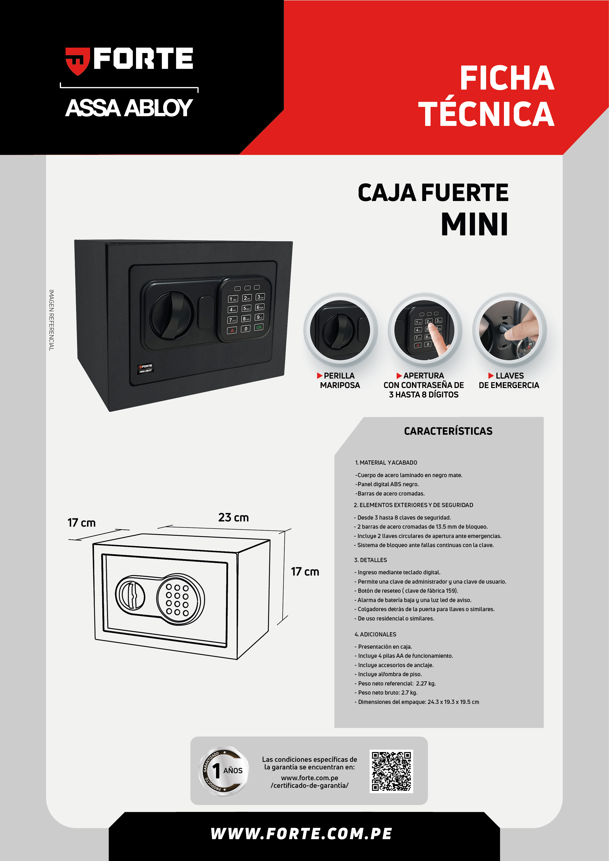 Caja fuerte de acero laminado con panel digital desde 3 a 8 dígitos para la contraseña, incluye pilas, tornillos de anclaje y llaves para apertura de emergencia, ideal para salvaguardas tus pertenencias más preciadas