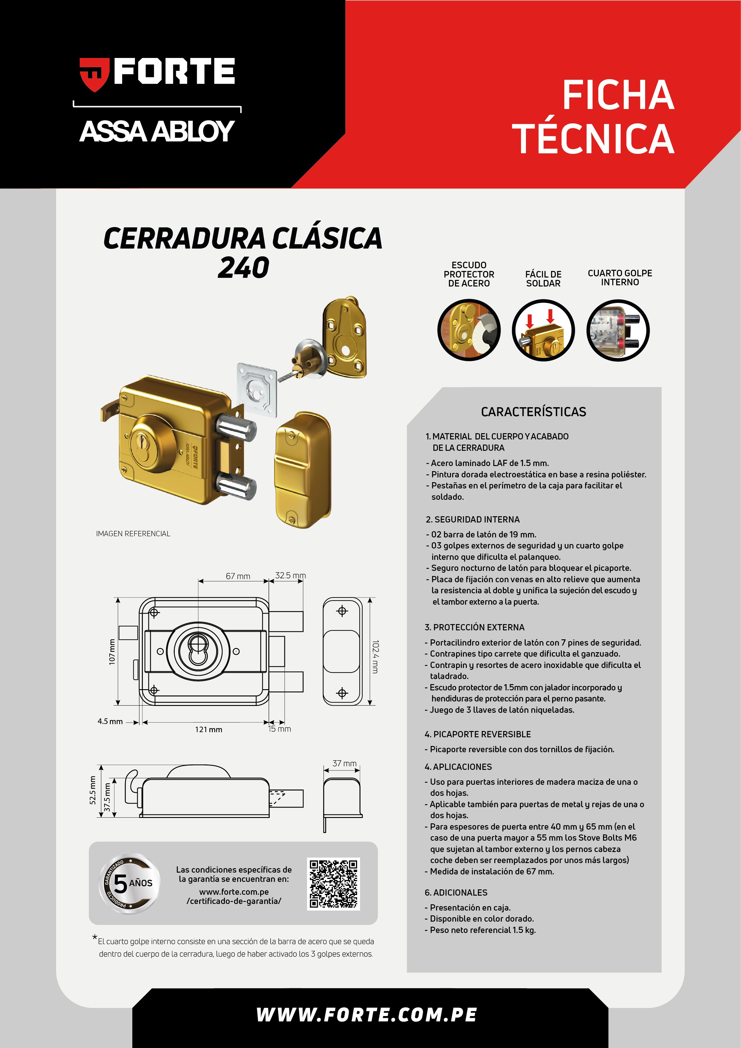Cerradura de sobreponer Forte Clásica 240 con dos barras de acero, 3 golpes de seguridad más un cuarto golpe interno, cilindro forte reforzado con 6 contrapines tipo carrete, un contrapin de acero inoxidable endurecido, resortes de acero inoxidable endurecido y un anillo tridente de acero que dificultan la vulneración con pata de cabra, taladro y ganzú, uso para puertas de madera y metal