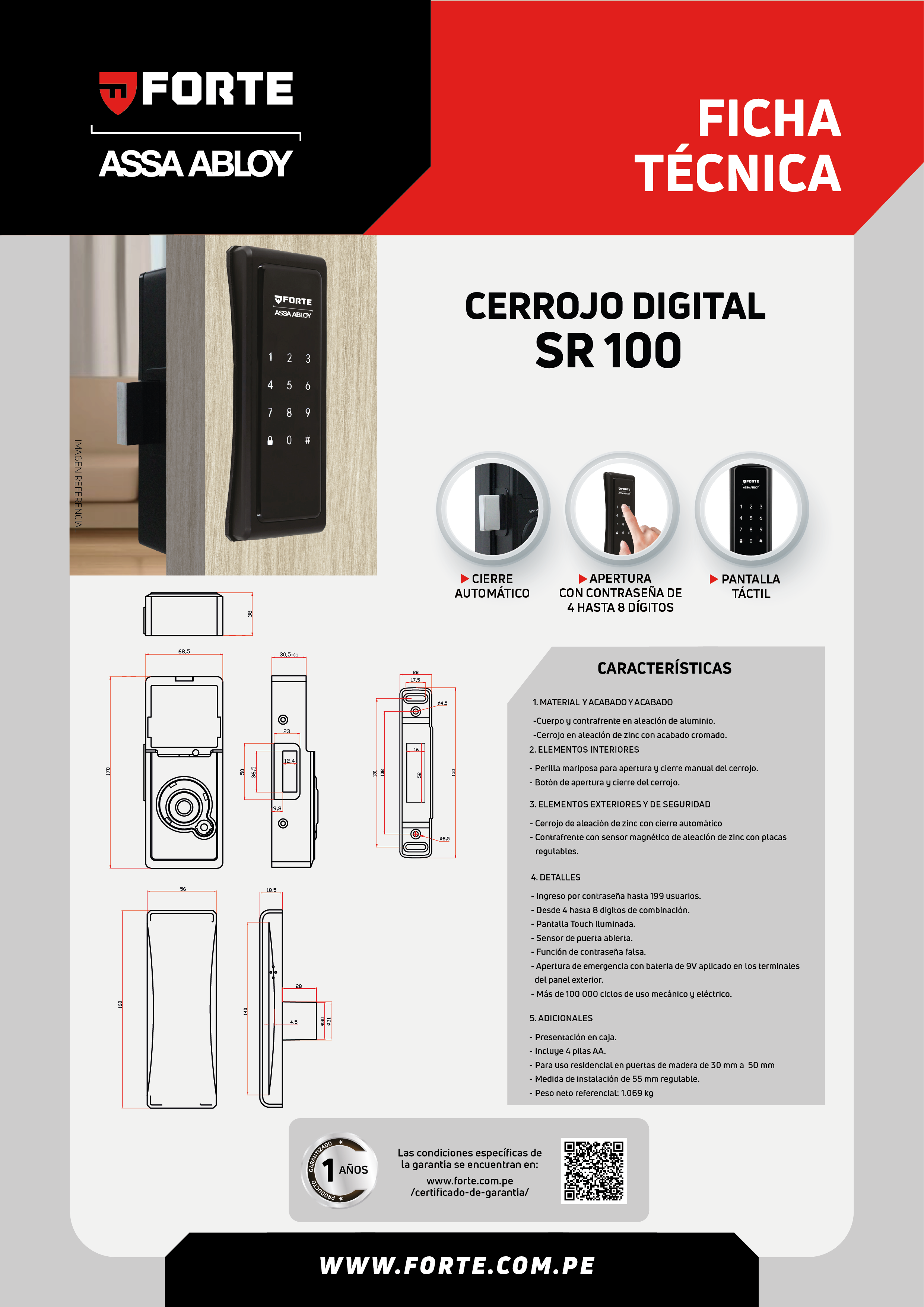 Cerrojo digital SR100, que la tecnología forma parte de tu hogar, con este moderno cerrojo tu seguridad estará en control, de fácil uso e instalación, ideal para puertas principales e interior de madera.
